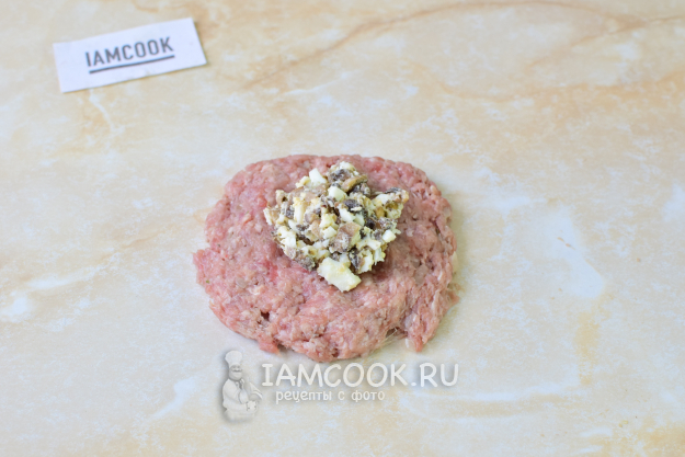 Из мясной массы сформируйте небольшую лепешку и выложите грибную начинку. Сформируйте котлетку с начинкой.