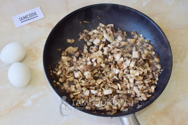 Для приготовления начинки отварите и очистите яйца. Грибы мелко нарежьте и обжарьте 5-7 минут, подсолите. Затем всё остудите.