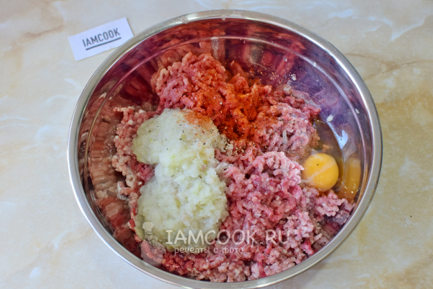 Мясо прокрутите через мясорубку вместе с луком. Добавьте яйцо. По вкусу подсыпьте соль и специи. Всё смешайте. Мясную массу отбейте о дно чаши, чтобы сделать её плотнее.
