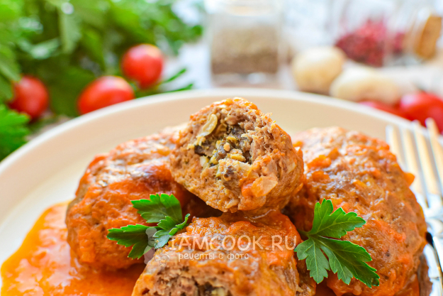 Готовой подливой залейте мясные зразы. Поставьте мясные зразы с подливкой в духовку примерно на 45-50 минут.