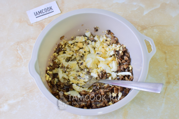 Отварные яйца разомните вилкой и смешайте с обжаренными грибами.