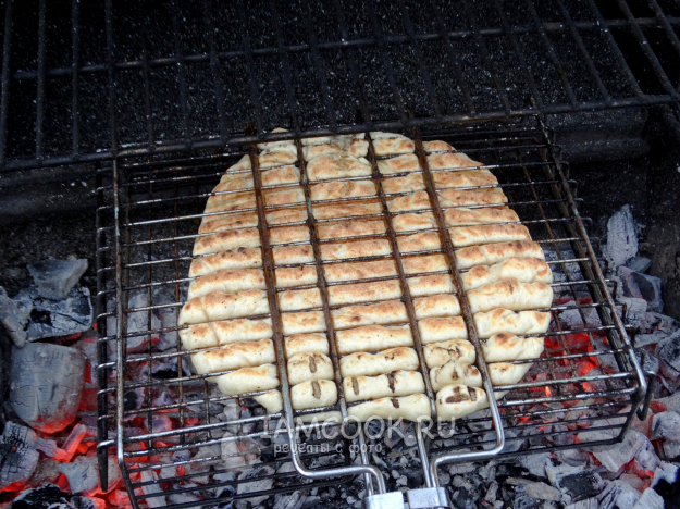 Поставить решётку на мангал, угли перед этим надо расчистить по сторонам.