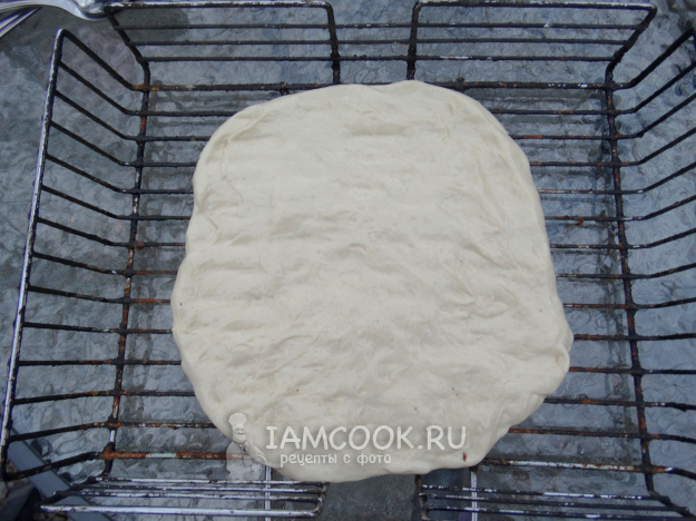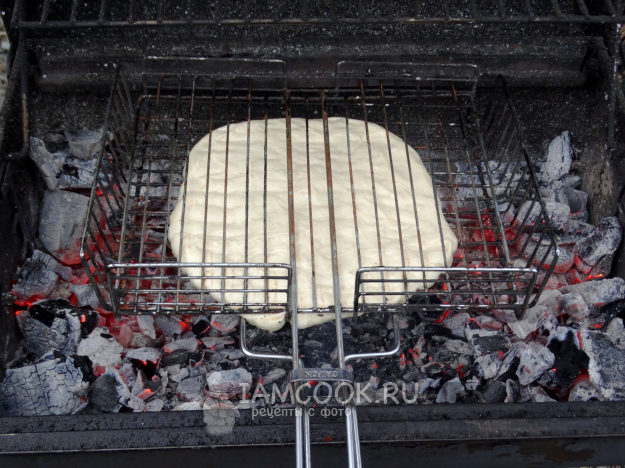 Поднявшееся тесто полить маслом, сразу на решётке сформировать круглую лепёшку.