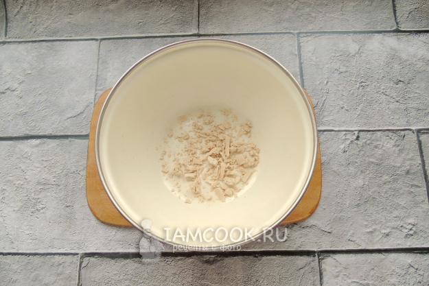Прессованные дрожжи накрошите в глубокую миску. Их можно заменить сухими быстродействующими, которых потребуется 7-8 грамм.