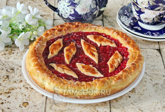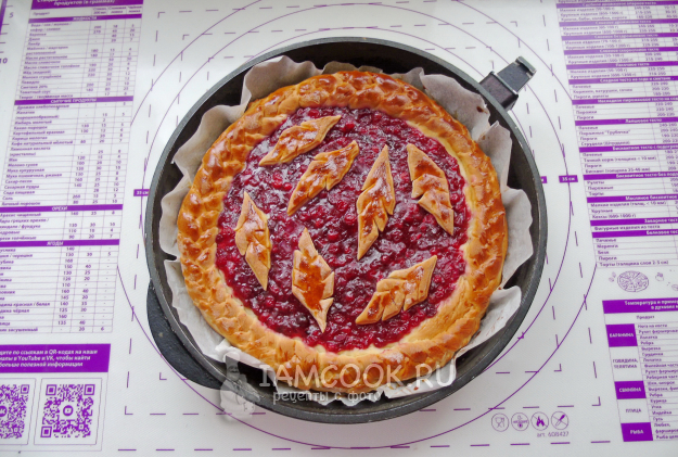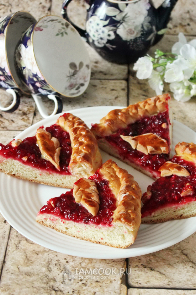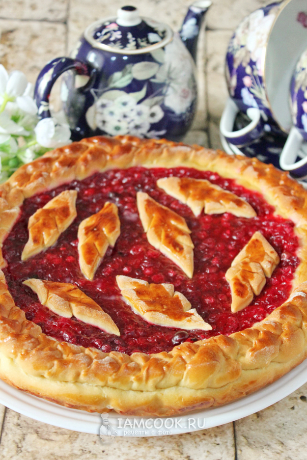 Открытый пирог с брусникой из дрожжевого теста готов.