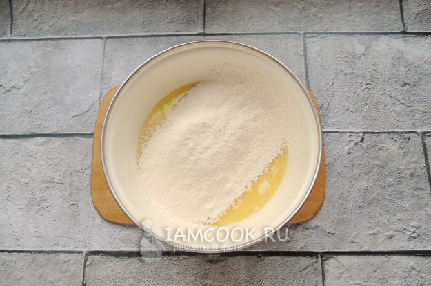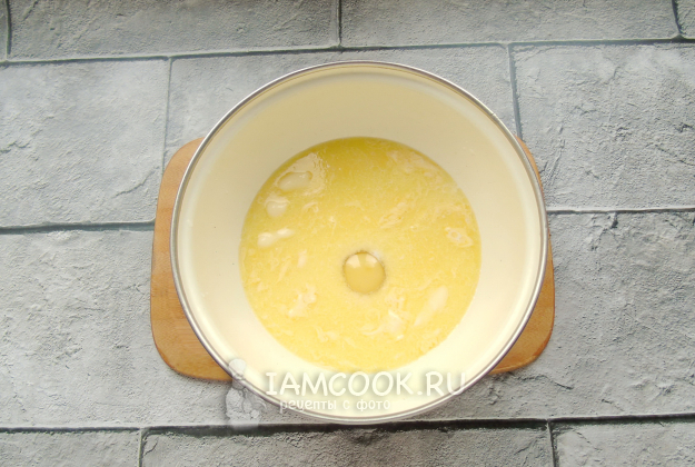 Налейте теплое молоко и перемешайте с дрожжами. Добавьте яйцо и растопленное сливочное масло, которое следует предварительно растопить и немного охладить. Масло можно заменить маргарином хорошего качества. Насыпьте соль, сахар и ванильный сахар. Перемешайте эти ингредиенты с молоком и дрожжами.