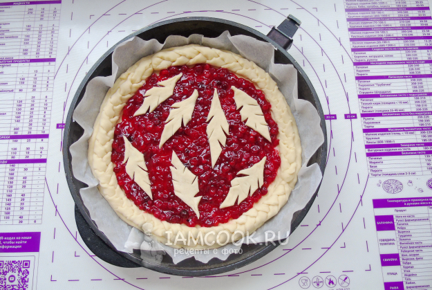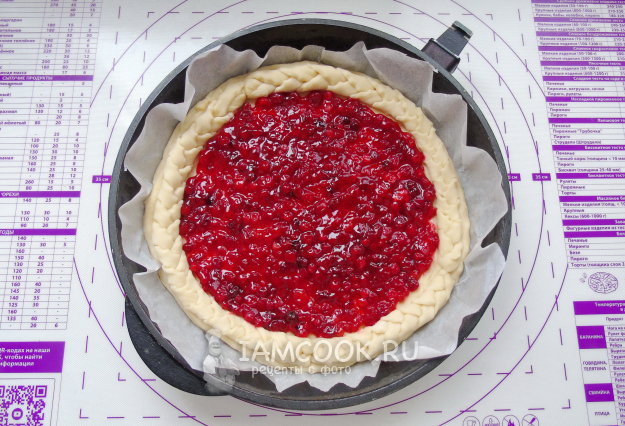 Сверху распределите начинку из брусники. Украсить открытый пирог можно разными способами. Я из теста сплела косичку и выложила её по краю пирога.