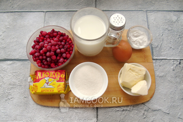 Ингредиенты для приготовления открытого пирога с брусникой из дрожжевого теста - перед вами, на фото.