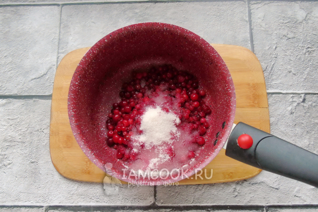 А пока тесто поднимается, приготовьте начинку. Бруснику помойте, выложите в кастрюлю с антипригарным покрытием и насыпьте сахар.