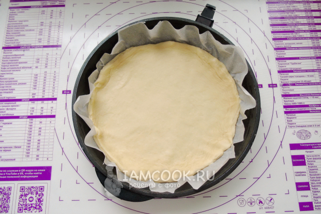 Из указанных ингредиентов получается два пирога диаметром 20-22 сантиметра. Достаньте тесто из миски и обомните. Разделите на две части. От каждой части отрежьте большую часть, а меньшую оставьте для украшения. Большую часть раскатайте в пласт и выложите в сковороду с пекарской бумагой.