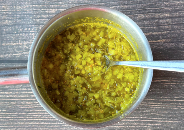 Варите релиш из огурцов на малом огне 5-7 минут после закипания, при этом не забывайте помешивать.