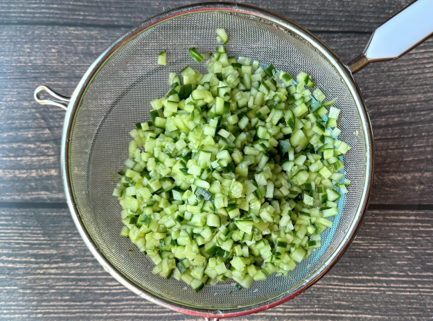 Далее откиньте кусочки огурцов на сито и промойте под проточной водой.