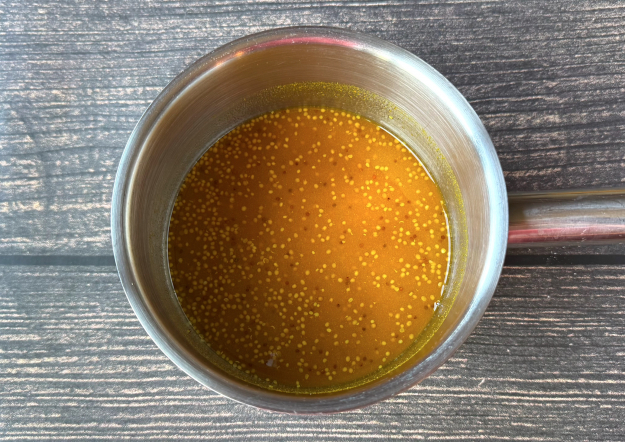 В сотейник влейте яблочный уксус, добавьте зернистую горчицу, куркуму и сахар, перемешайте.