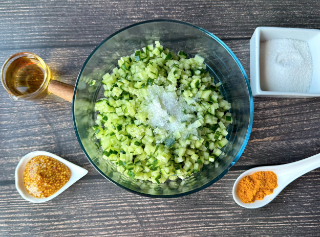 Выложите нарезанные огурцы в миску, добавьте соль и тщательно перемешайте. Оставьте их в таком виде на 1 час — за это время излишки жидкости выделятся.