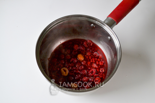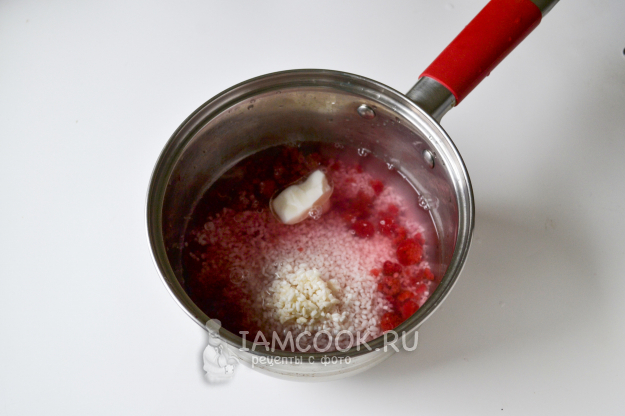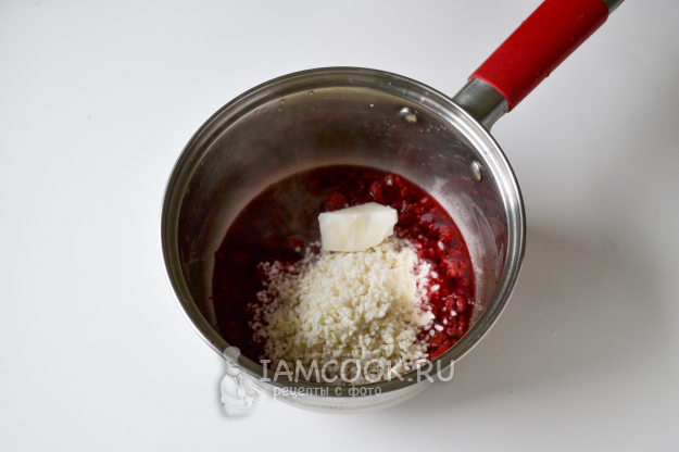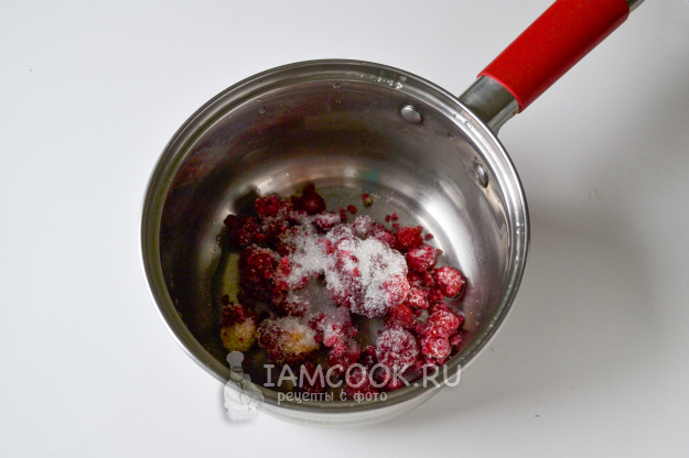 В сотейник положите малину, всыпьте сахар, влейте воду (100-150 мл) и поставьте на огонь.