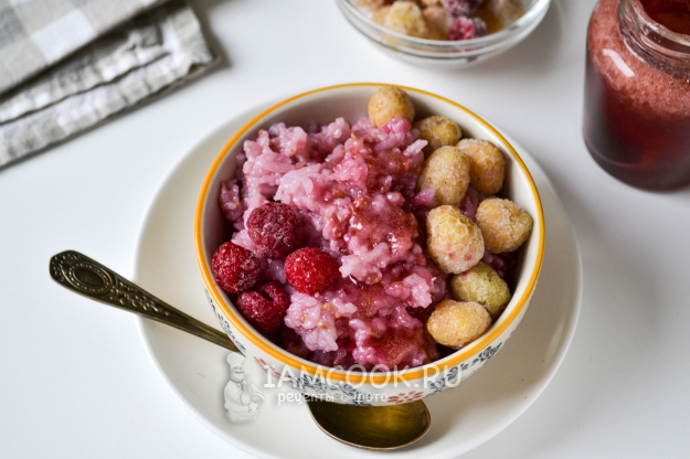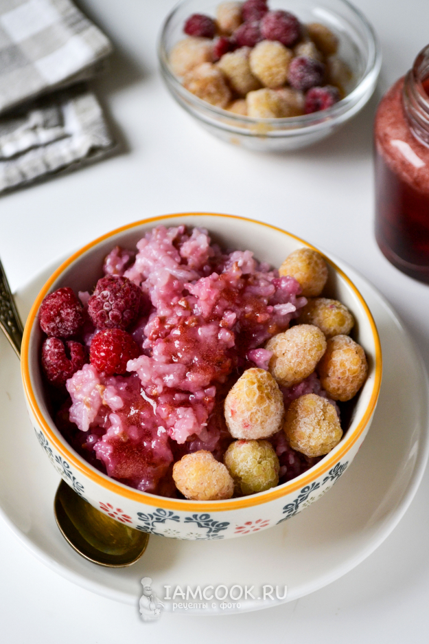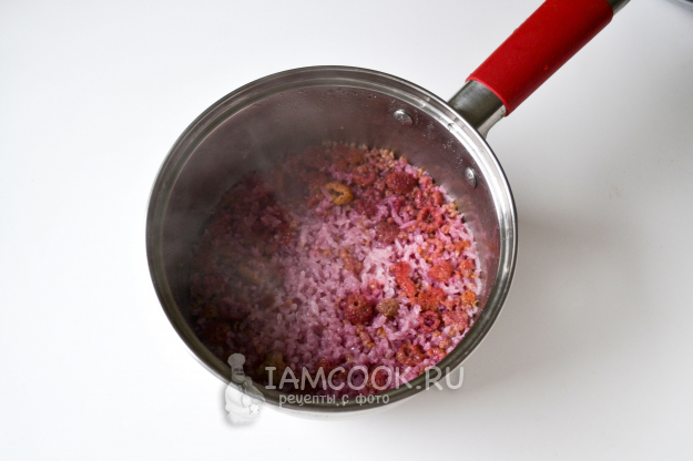 Подавайте рисовую кашу с малиной горячей с ягодами или вареньем.