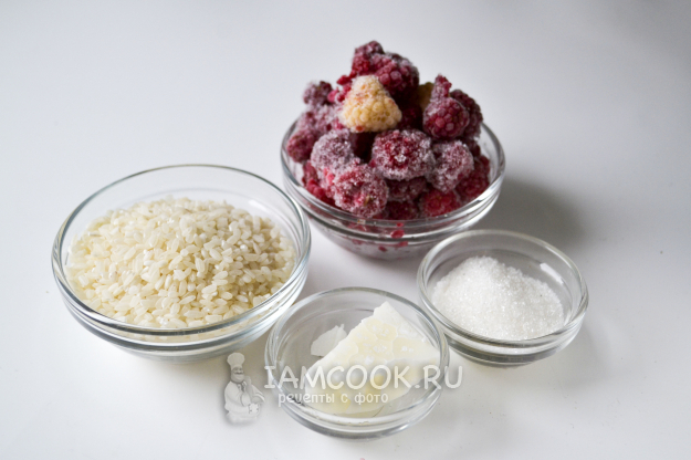 Продукты для приготовления постной рисовой каши с малиной соберите по списку. Размораживать ягоды не обязательно. Рис, лучше взять круглый, промойте в нескольких водах. Масло для каши я использую кокосовое. Можно взять любое растительное без запаха.