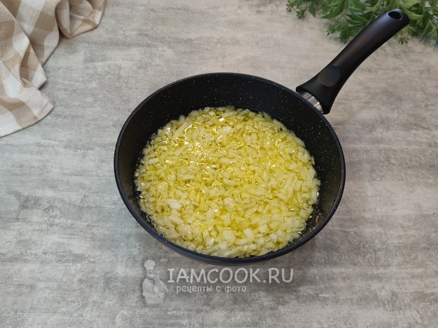 Закончим с начинкой). В сковороде разогрейте топленое или сливочное масло, обжарьте мелко нарезанный репчатый лук до прозрачности и мягкости.