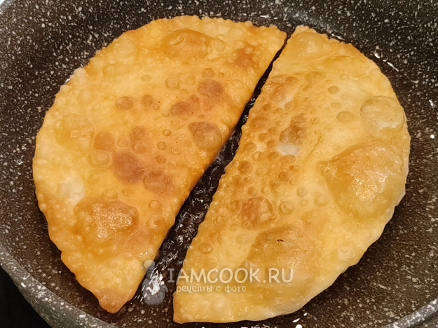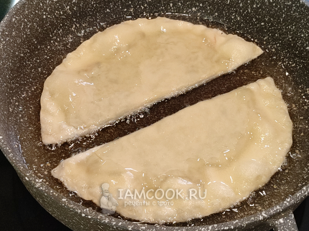 Я не использую фритюр и много масла для жарки. Достаточно будет покрыть дно сковороды маслом на толщину чебурека - примерно на 5-6 мм. Разогрейте масло, затем убавьте огонь на средний (6-7 из 9), обжаривайте чебуреки с обеих сторон до румяной корочки.