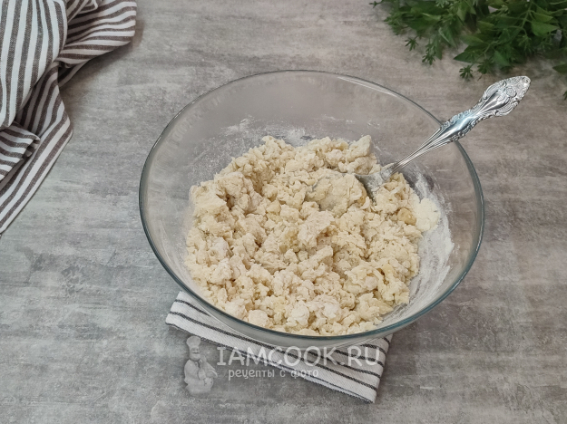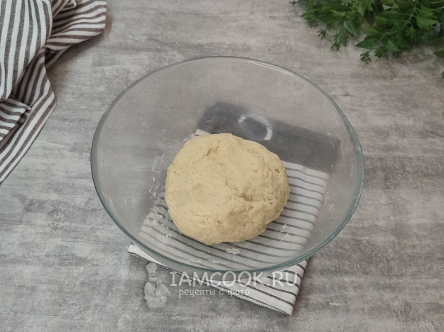 Затем, когда тесто уже немного остынет, замесите его руками, при необходимости досыпая оставшуюся муку. Накройте пленкой, оставьте отдохнуть минут на 15-20.