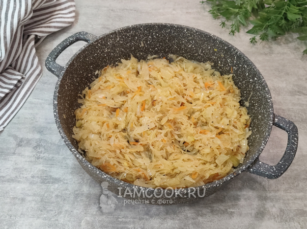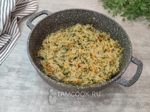 Выложите к луку капусту, обжарьте до желаемой консистенции (мягкости), я люблю хрустящую капусту, жарю недолго, минут 6-7.