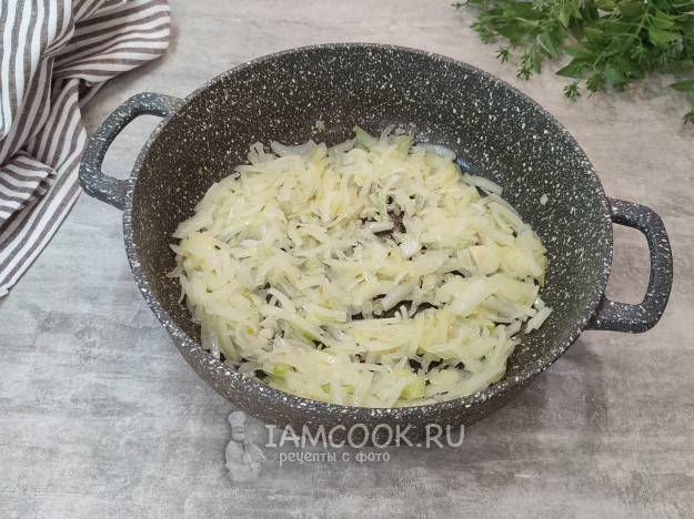 Для начинки нарежьте тонкой недлинной соломкой репчатый лук, обжарьте до мягкости и легкой румяности.
