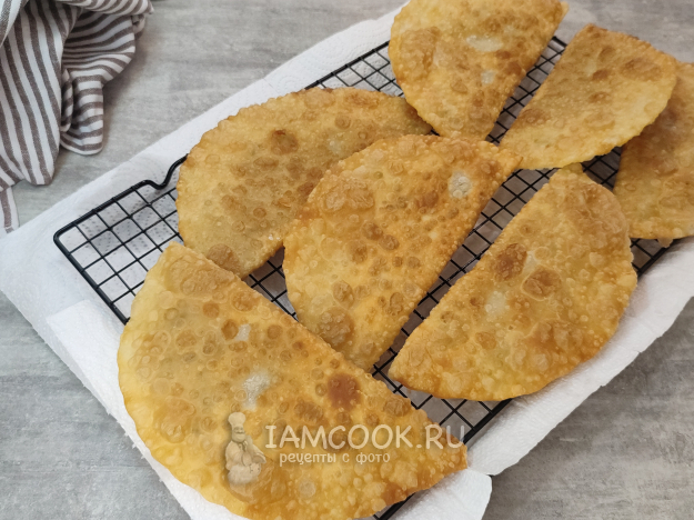 Готовые чебуреки лучше выкладывать на решетку или сетку (можно воспользоваться решеткой от духовки), так и лишнее масло стечет, и чебуреки несколько дольше будут оставаться хрустящими, чем если вы выложите их после жарки на бумажные полотенца.