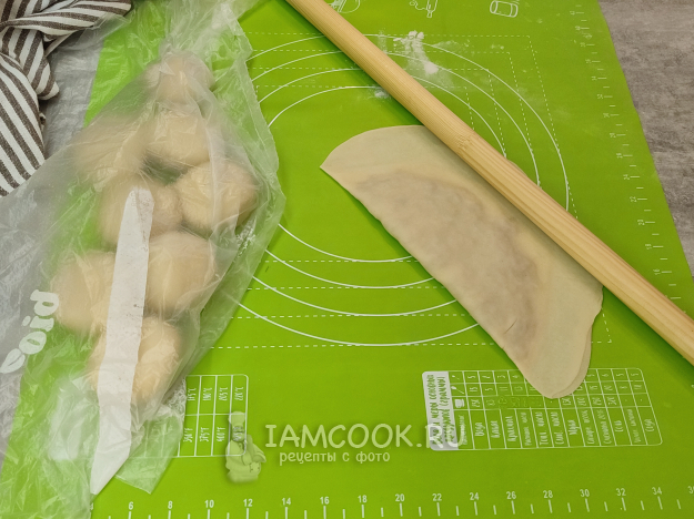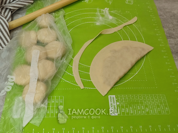 Тесто делим на желаемое количество порций. Учитывайте диаметр вашей сковороды). У меня получилось 10 чебуреков, десятый - из обрезков теста. Заготовки округлите, уберите под пленку, чтобы тесто не заветрилось. Каждую заготовку раскатываем в тонкий круг, при необходимости подпыляя рабочую поверхность мукой. На одну сторону выкладываем начинку тонким слоем.
