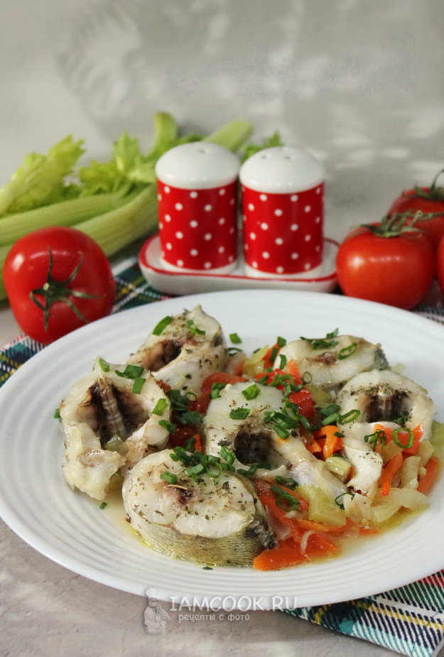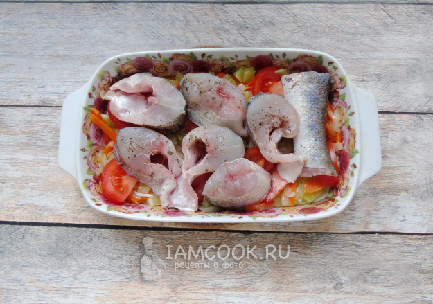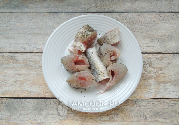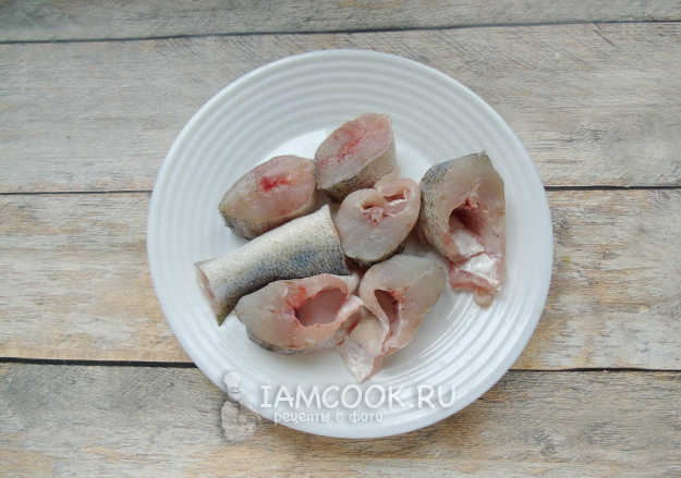Рыбу (у меня был судак) очистите, выпотрошите, удалите голову и плавники. Тщательно помойте снаружи и внутри. Нарежьте на порционные кусочки.