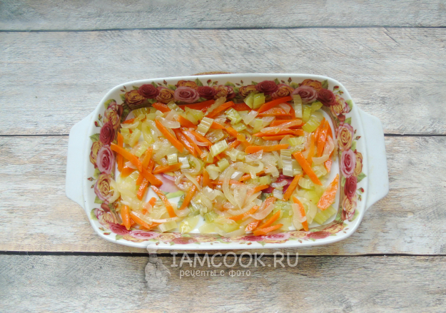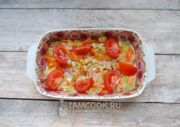 Лук, морковь и сельдерей выложите в форму для запекания.