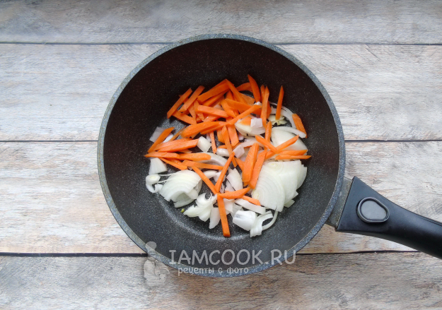 Морковь и репчатый лук очистите, помойте и нарежьте произвольно. Выложите в сковороду.