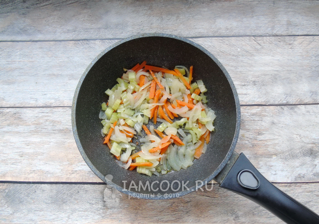 Сельдерей стеблевой помойте и нарежьте. Добавьте в сковороду с луком и морковью. Налейте растительное масло.