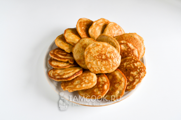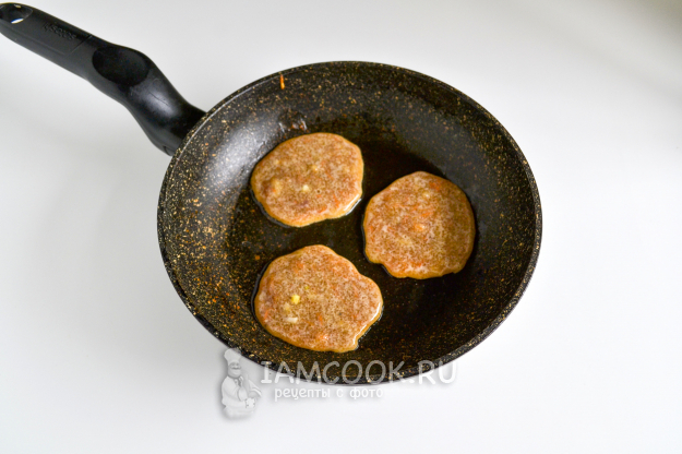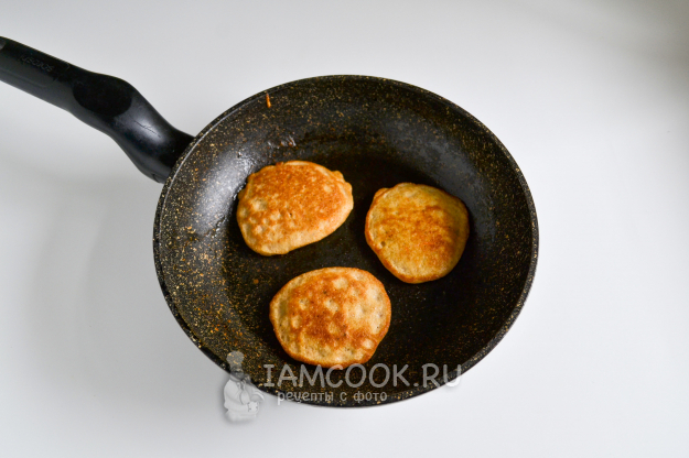 Когда нижняя сторона оладий станет румяной, переверните. Также под крышкой на тихом огне жарьте до готовности.