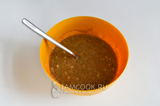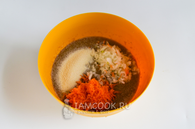 Добавьте к икре манную крупу, натертую на мелкой терке морковь и мелко нарезанный репчатый лук, соль, перец черный молотый.
