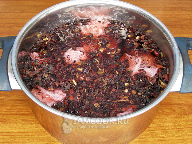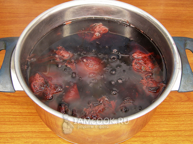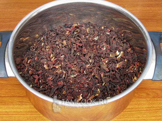 В горячую воду насыпаем соль, каркаде, размешиваем и оставляем минут на 5. Можно использовать чай каркаде в фильтр-пакетах.