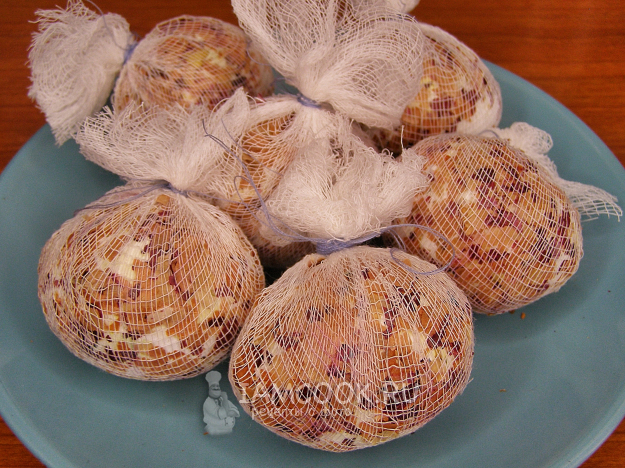 Плотно заворачиваем яйцо с шелухой в марлю и завязываем ниткой. Таким же образом заворачиваем все яйца.
