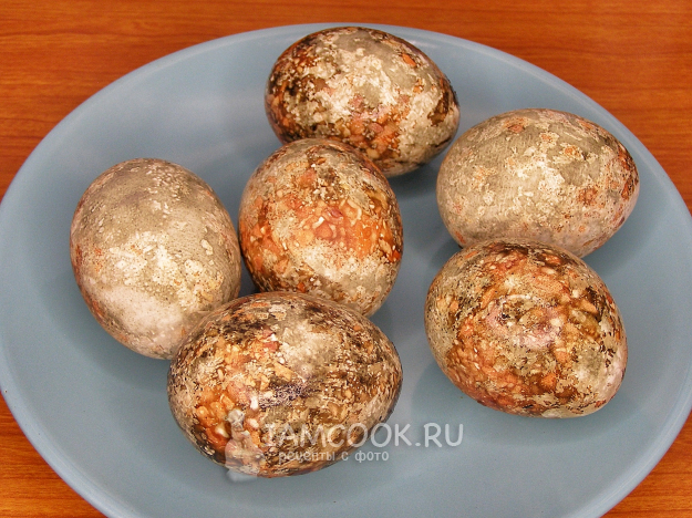 Яйца нужно заранее, примерно за час до варки, достать из холодильника, чтобы они согрелись до комнатной температуры. Луковую шелуху можно взять от обычного репчатого и от красного лука, но можно и только от одного вида лука.