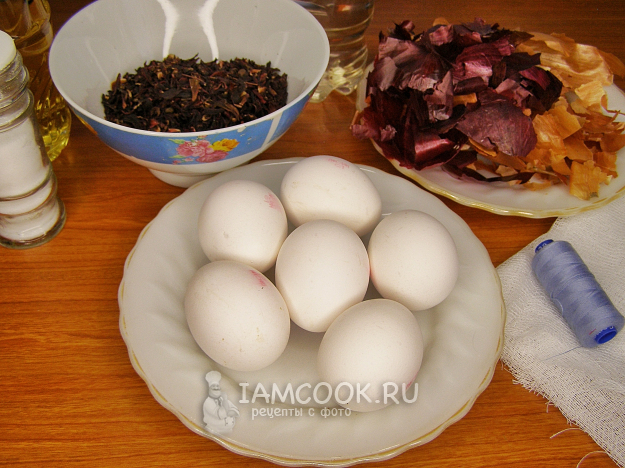 Соберём необходимые ингредиенты для приготовления мраморных яиц с чаем каркаде на Пасху. Помимо указанных продуктов, вам понадобятся 6 кусочков марли размером примерно 20 на 20 сантиметров и нитки.