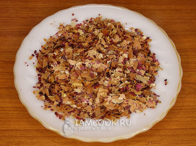 Луковую шелуху измельчаем блендером или режем ножницами на маленькие кусочки.