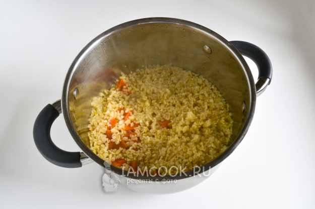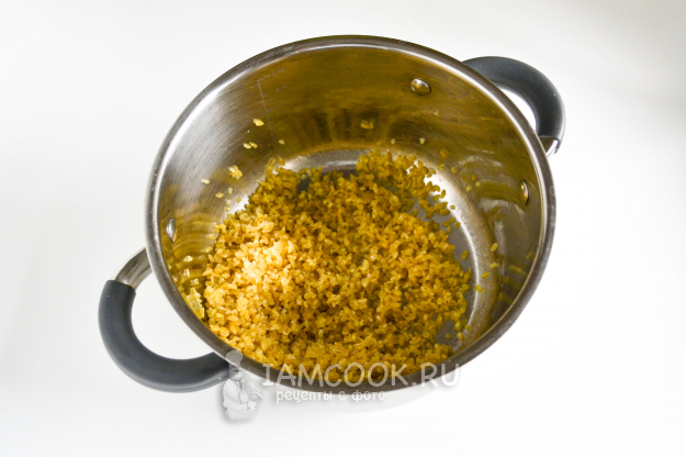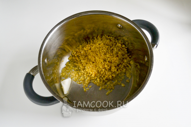 Постоянно помешивая, обжарьте крупу на среднем огне 2-3 минуты.