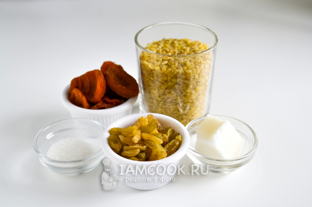 Продукты для приготовления каши из булгура с сухофруктами соберите по списку. Вместо кокосового масла можно использовать любое растительное. Изюм и курагу тщательно промойте. Если сухофрукты очень сухие, то можете залить их на 10-15 минут теплой водой.