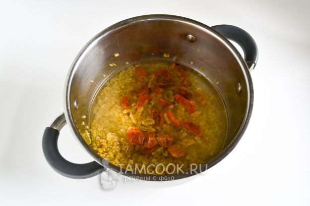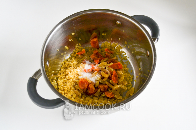 Положите в кастрюлю с булгуром изюм и курагу, нарезанную на кусочки. Добавьте сахар и соль.
