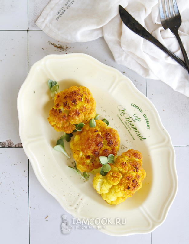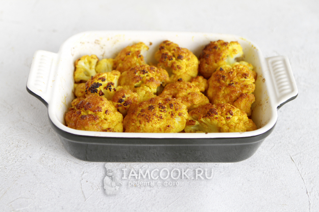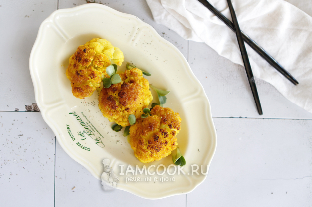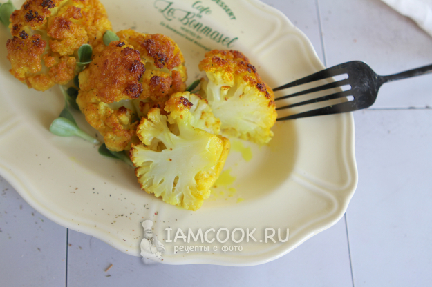 Цветная капуста в духовке с куркумой готова. Ее можно подать в качестве закуски или гарнира к основному блюду.