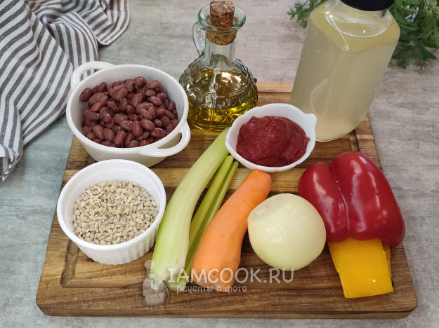Соберите ингредиенты для приготовления супа с перловкой и фасолью. У меня перец - по половинке двух цветов (остался от другого блюда), вы возьмите любого цвета. Фасоль подойдет как белая, так и красная. Предлагаю взять именно консервированную (слив с нее жидкость), чтобы не тратить много времени на готовку.