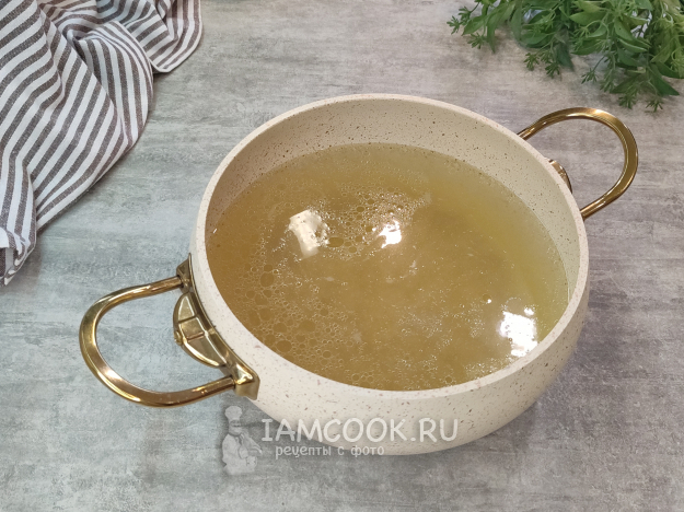 Промытую перловку отправляем в кипящий бульон и на среднем огне варим практически до готовности. Можно замочить крупу заранее, часа на 2-3, она сварится несколько быстрее, я не замачивала, минут через 30-35 перловка была почти готова).