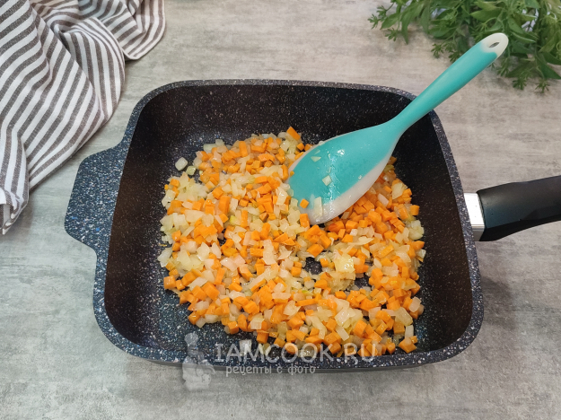 Добавим морковь, обжарим, помешивая, еще пару минут.