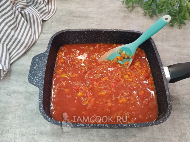 После вливаем воду, протушим недолго, минут 5-7. Добавьте по вкусу сахар, чтобы сбалансировать кислинку от томата.