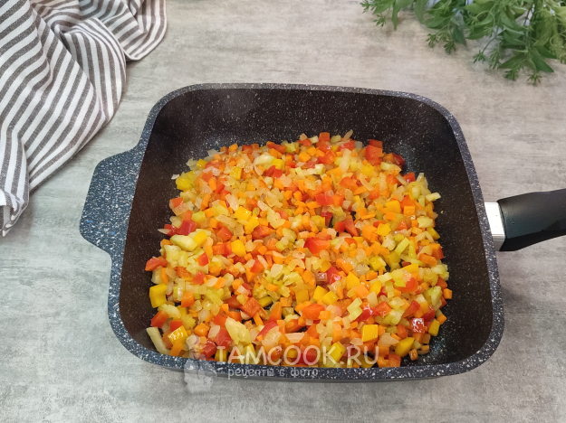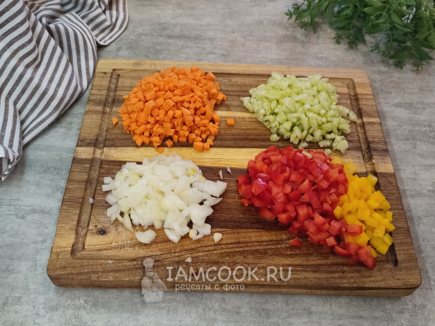 Затем добавим сельдерей, перец, и жарим еще минуту-другую. Не надо их сильно зарумянивать, достаточно, чтобы овощи просто стали мягче.