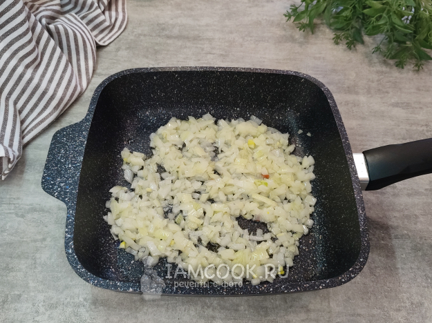 Я не всегда делаю такую овощную зажарку, в основном, когда супы варю без мяса. Но в данном случае у меня было время, пока варится крупа, поэтому решила их обжарить). В сковороду выкладываем лук, обжариваем до прозрачности.