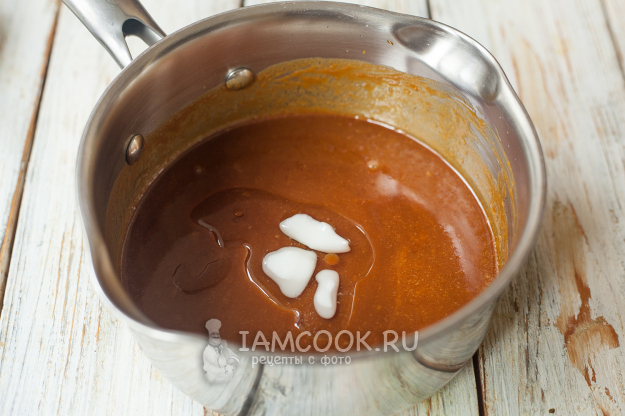 Влейте горячие растительные сливки в карамель небольшими порциями, сразу же перемешивая ложкой. Предупреждаю, что будет мощное бурление и, возможно, горячие брызги, поэтому аккуратнее.